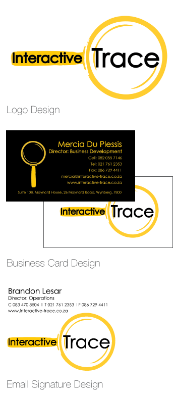 Interactive Trace is a a tracing company in Cape Town. They required a logo that says what they do from first glance. The magnifying glass seems to work well on all their stationary and stands out visually.