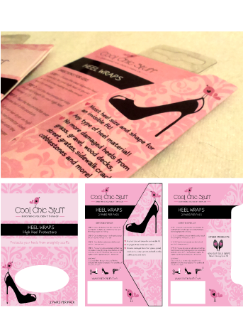 The product is heel wraps, which was packaged in a envelope type package. The design was to reflect the company, thus the use of the pattern and colours. There was a window in the package to allow the customer to feel the product through the package. All the instructions were placed on the back as well as the other products availible. The final product was made out of a plastic material and the die design allows the customer to reuse the package as a storage for the extra products not being used.