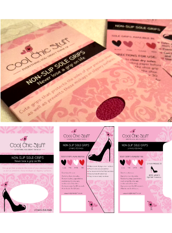 The product is sole grips, which was packaged in a envelope type package. The design was to reflect the company, thus the use of the pattern and colours. There was a window in the package to allow the customer to feel the product through the package. All the instructions were placed on the back as well as the other products availible. There are also the various colour choices for the product. The final product was made out of a plastic material and the die design allows the customer to reuse the package as a storage for the extra products not being used.