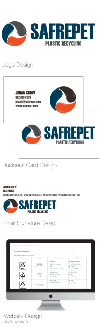 SAFREPET is a bottle-to-bottle recycling company based in Cape Town. They required a logo that had a recycling look and feel. The colour pallet was to be simple but striking.